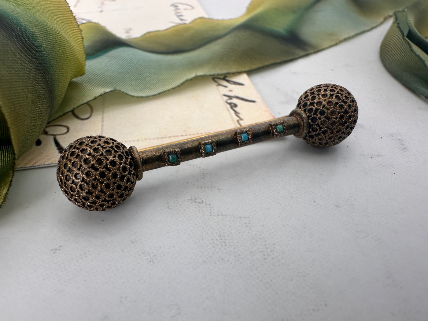 Delicate and full of charm, the Elodie Brooch is a petite treasure from the Victorian–Edwardian era. Crafted in antique gold, its unique dumbbell silhouette is adorned with four soft turquoise stones, adding just the right touch of color and elegance.