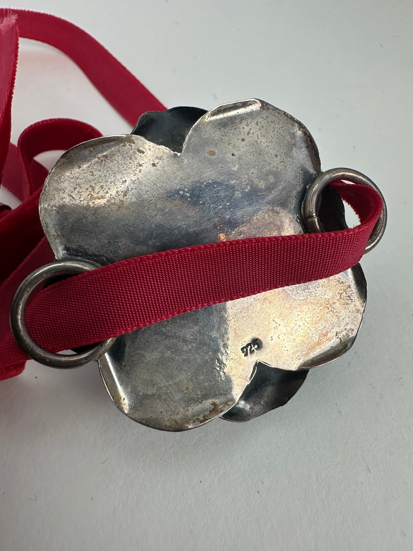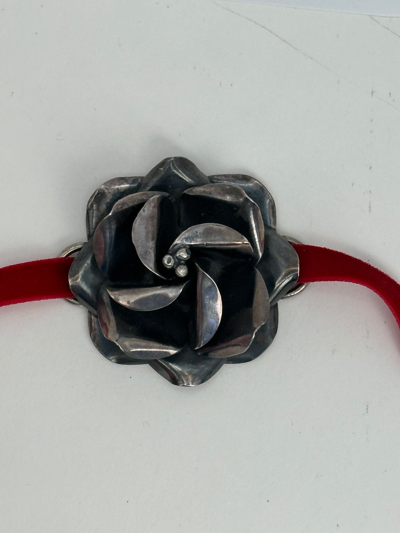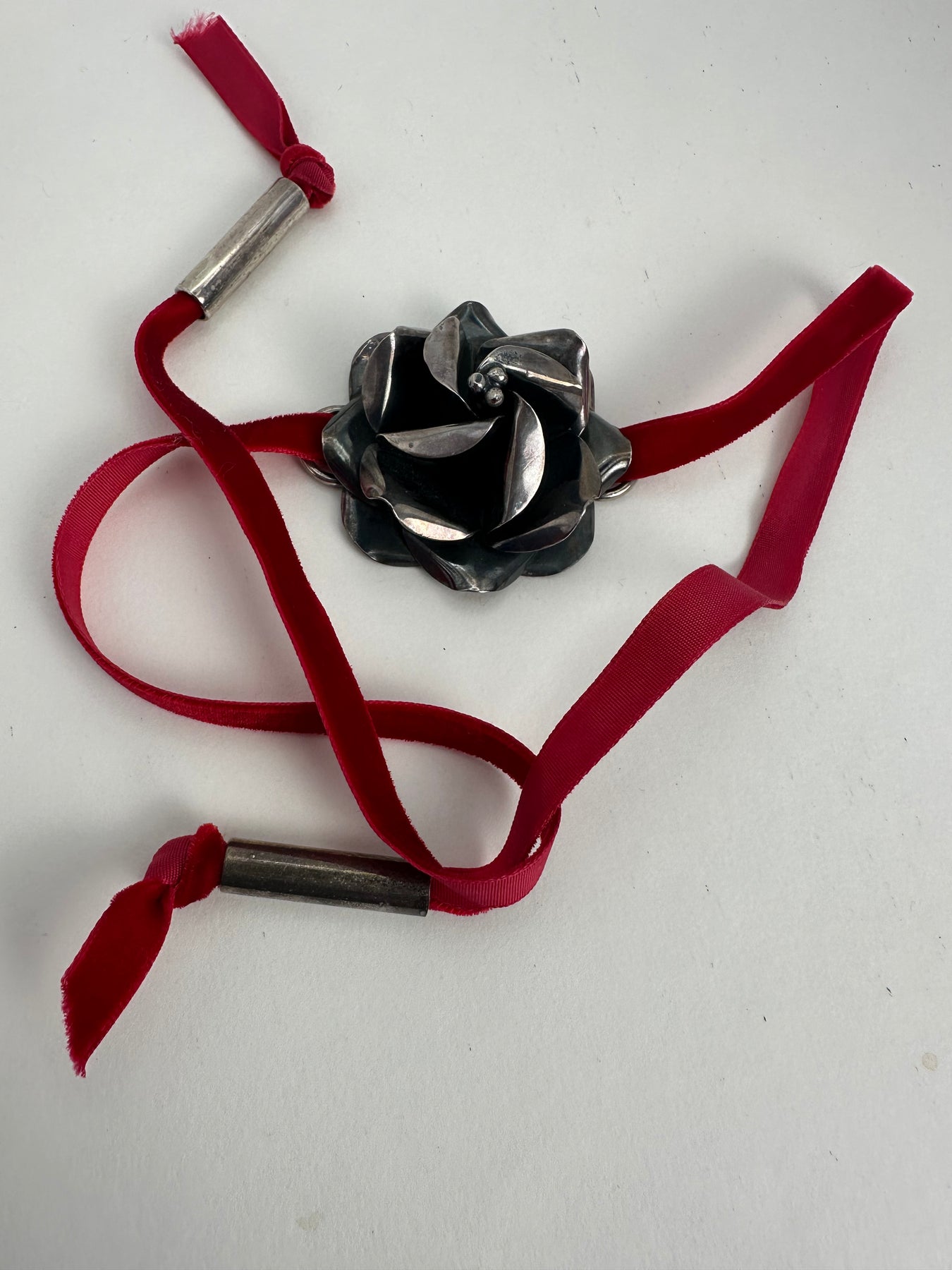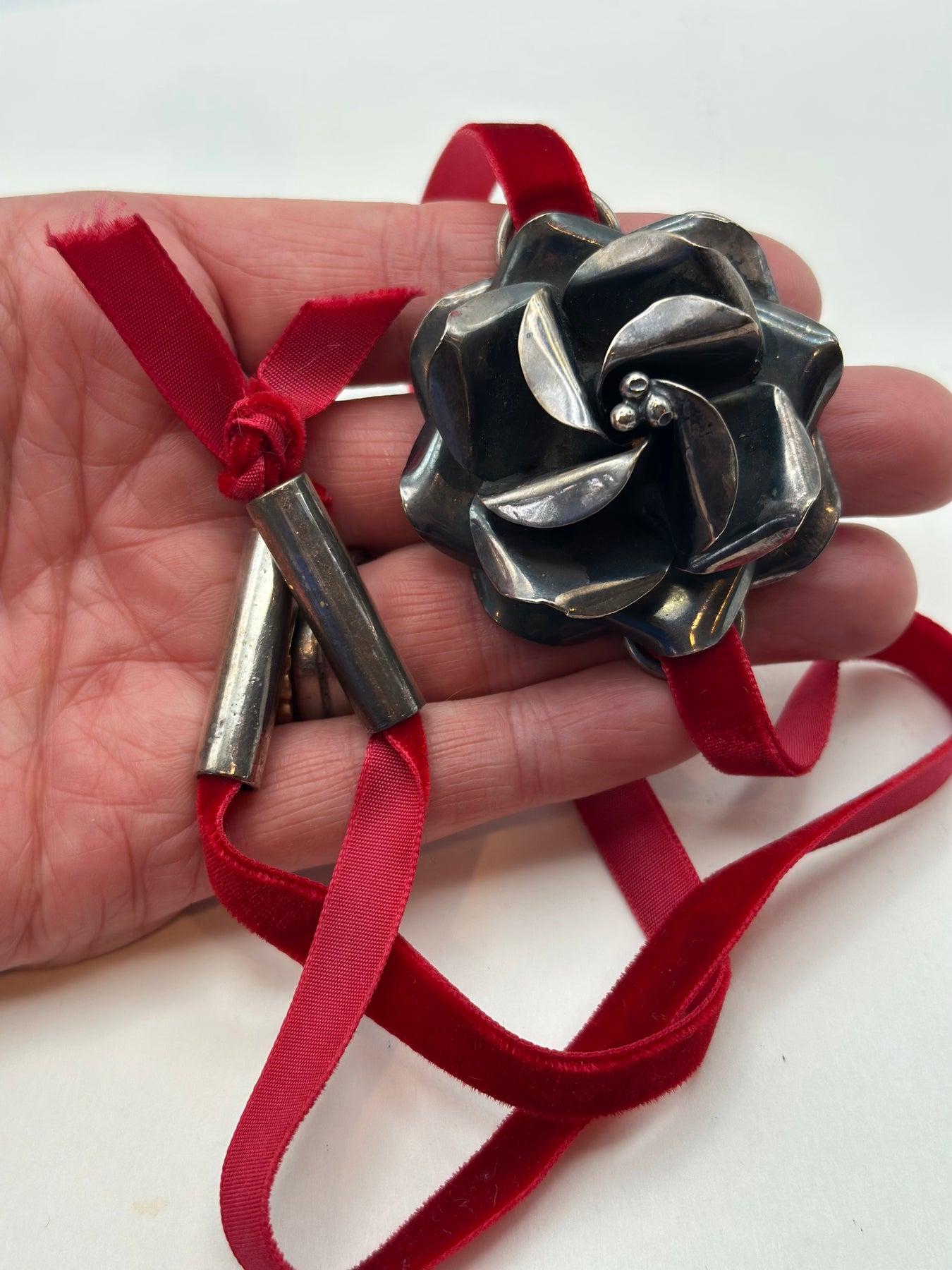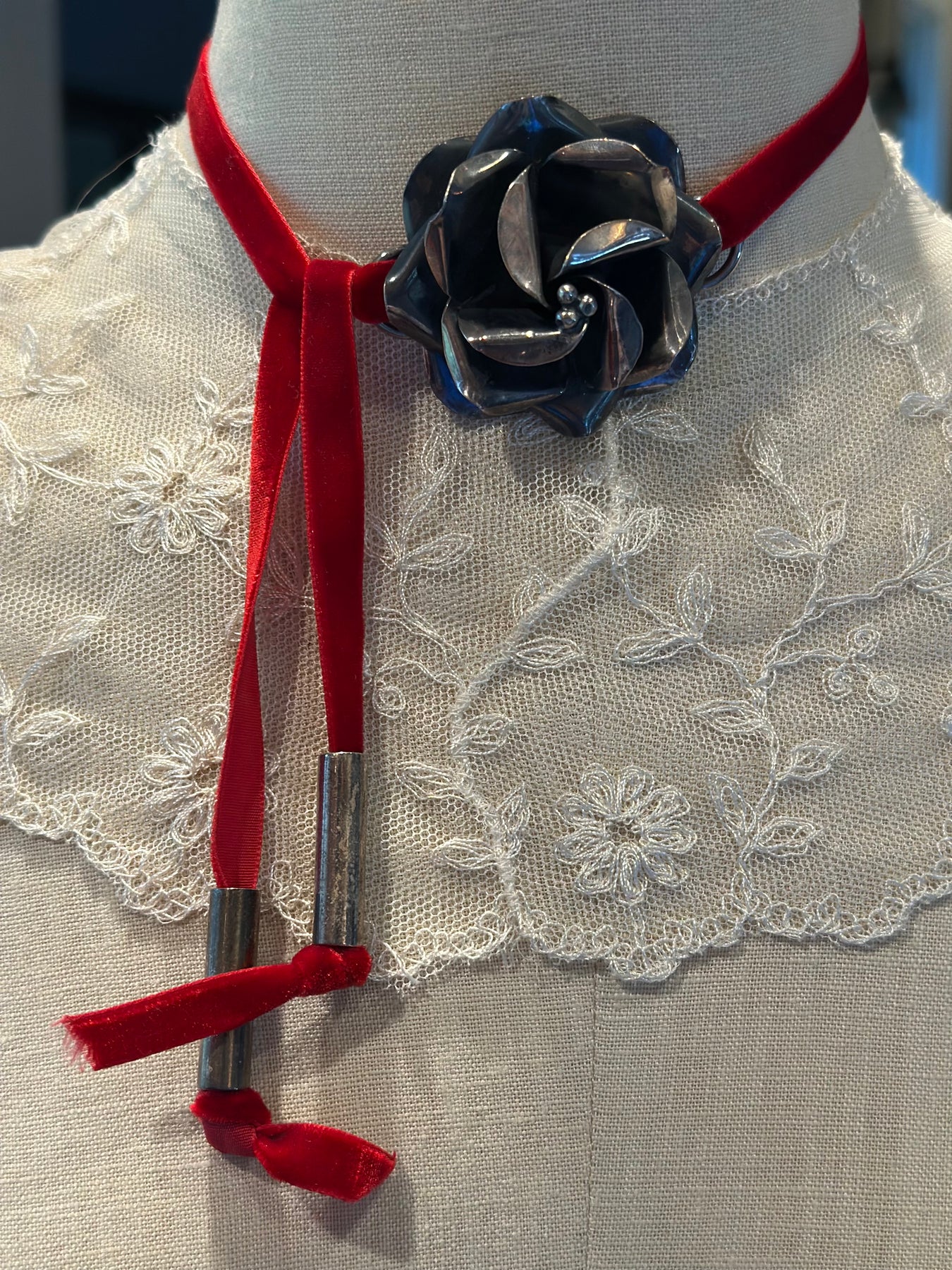 Meet Adeline Rose, a piece that feels like it stepped out of an old love letter. This choker features a finely detailed sterling silver rose, symbolic of devotion, elegance, and the beauty of things meant to last. Suspended from a soft velvet ribbon and sterling silver endcaps, she sits gracefully at the collarbone—equal parts vintage romance and modern allure.